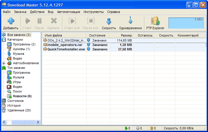 Download Master эффективно решает 3 главных проблемы возникающих при закачке файлов из Интернет: скорость закачки, продолжение прерванных закачек и управление закачанными файлами. При этом Download Master бесплатен во всех версиях.