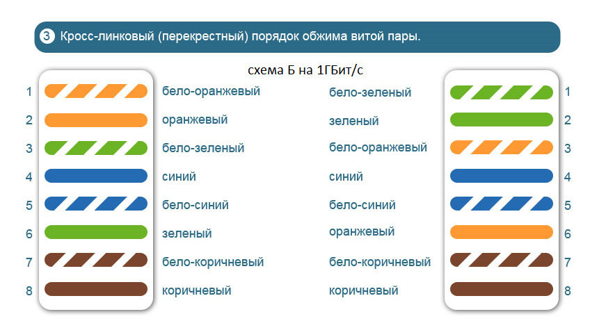 Этот вариант предполагает подключение компьютеров в локальную сеть напрямую через сетевую карту одного к сетевой карте второго. Слово кроссовер (crossover) предполагает перекрестную последовательность проводков на разных концах кабеля.