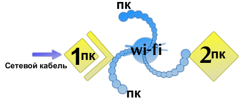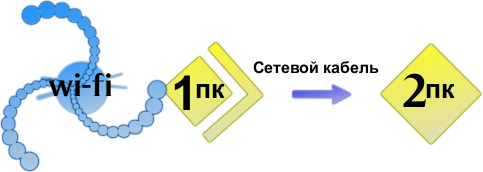 В роли источника сети - кабель, соединение компьютеров через wi-fi (1-ый в роли точки доступа, а 2-ой в роли клиента; на обоих пк должен быть wi-fi адаптер).