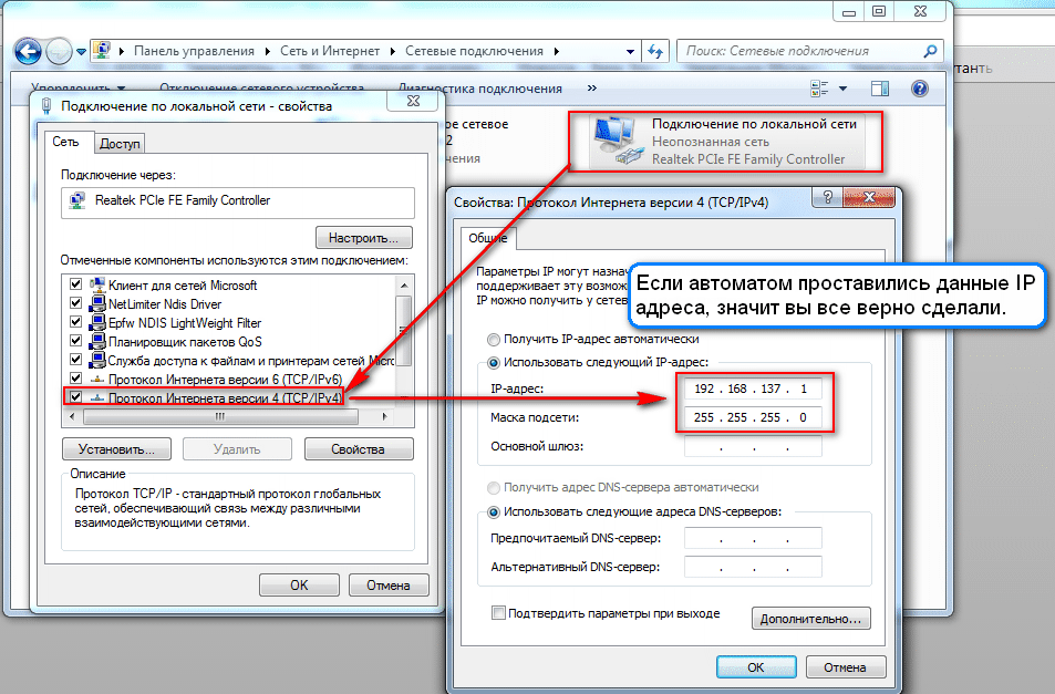 Настройка закончена! ПК-1 должен раздавать инет по кабелю уже во всю... Нет, поверяем:У ПК-1 после включения опции расшарки в настройках локальной сети должны автоматически прописаться следующие параметры, заходим смотрим: