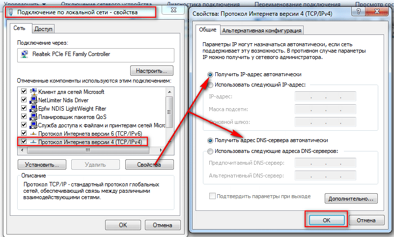 Соединяем между собой ПК сетевым кабелем (витая пара). После чего и на одном и на другом пк, заходим в сетевые подключения (в панели управления) и ставим крыжики на получении автоматически IP & DNS адресов: