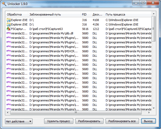 (программа отобразит нам список запущенных процессов на данном носителе,которые можно удалить,разблокировать)